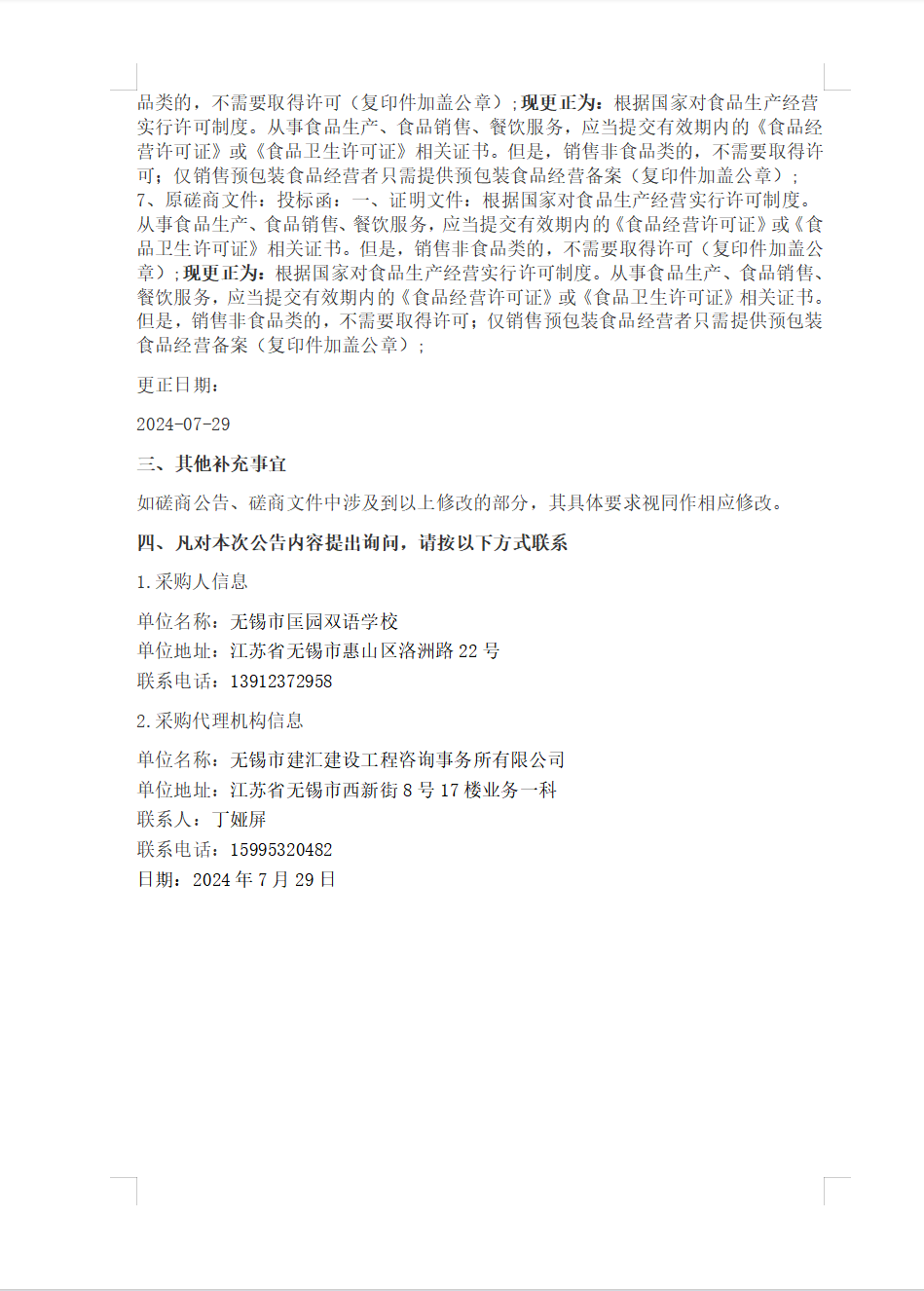 2024年无锡市匡园双语学校便利店物品采购项目更正公告