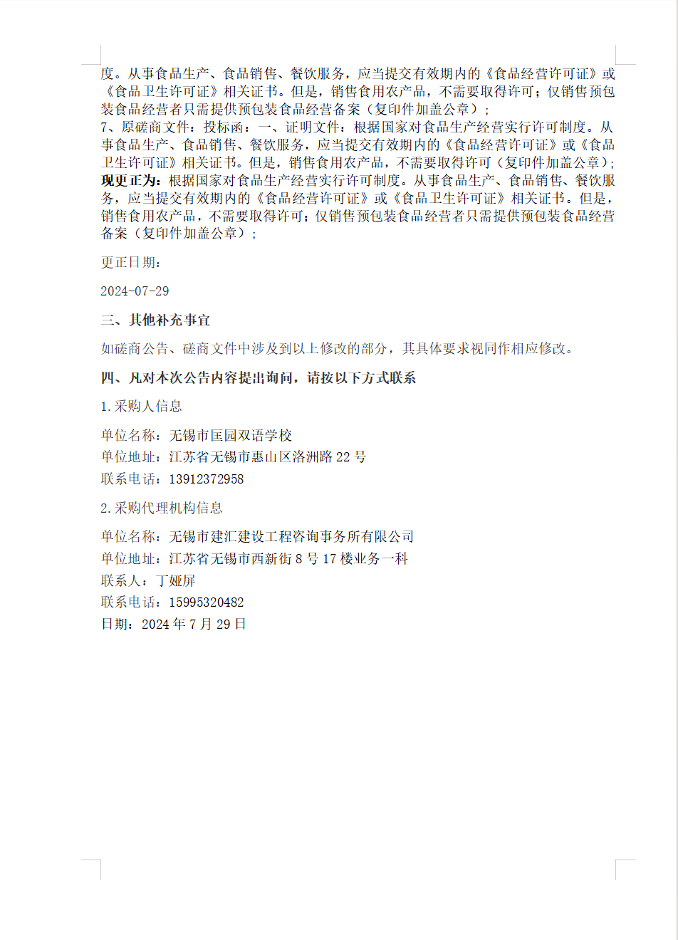 2024年无锡市匡园双语学校食材供货及配送项目更正公告